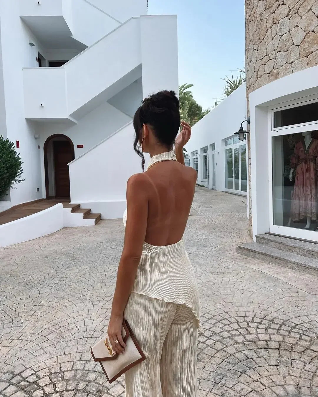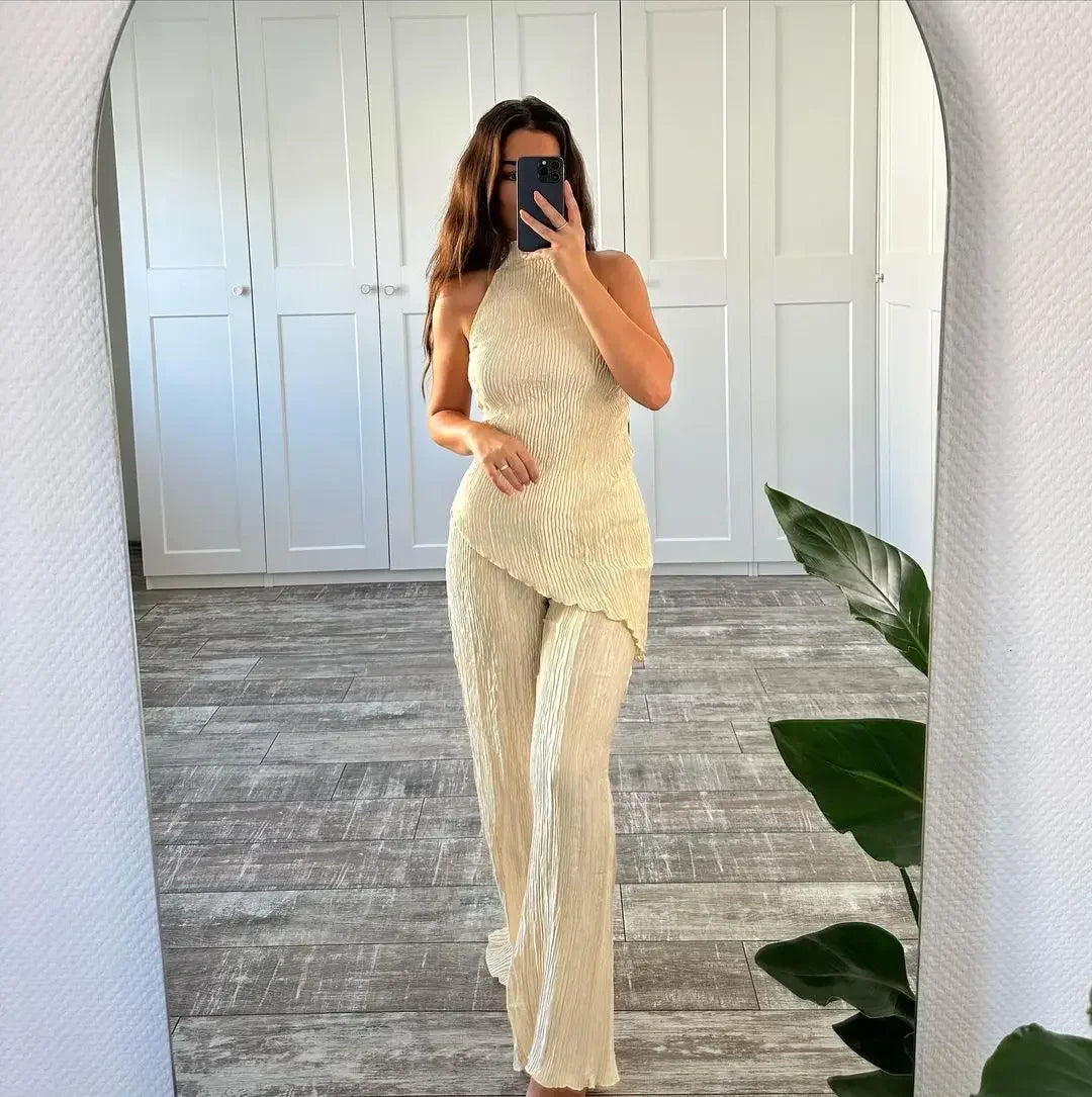 Unser Zweiteiler- Set ist der Inbegriff moderner Eleganz und stilvoller Raffinesse. Dieses Set besteht aus einem schulterfreien Top und passender weit ausgestellter Hose. Das Oberteil betont deine Schultern, während der schräge Schnitt deine Figur perfekt in Szene setzt. Die Hose rundet den Look harmonisch ab und sorgt für ein elegantes Auftreten.